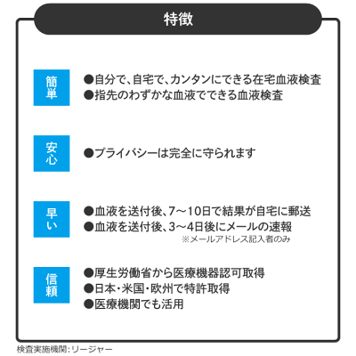 使用方法 1.キットが届く 2.指先から採血(血液検査はわずか約0.065mlでOK) 3.記入した検査申込用紙、質問票とともに返送(送料無料・郵送) 4.3〜4日で速報メールが届きます(メールアドレス記入者のみ) 5.7〜10日で検査結果がご自宅に郵送で届きます。